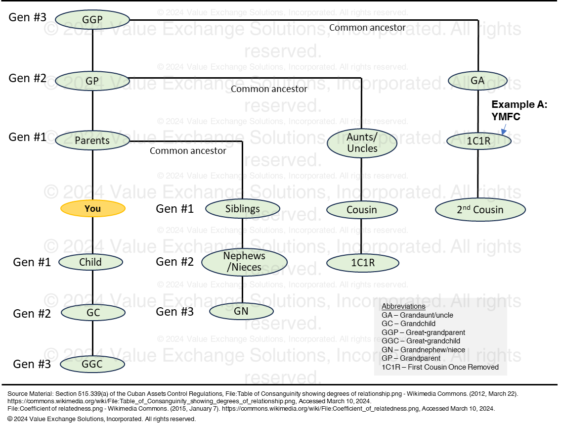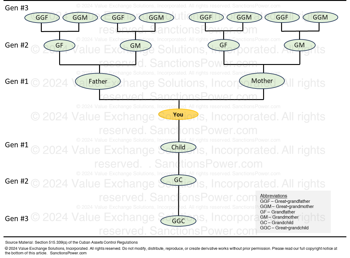In conclusion, we have learned who is defined as a Close Relative in Section 515.339 of the Cuban Assets Control Regulations. A helpful way of thinking of it visually, is anyone who fits into someone’s Close Relative Family Tree, by blood, marriage, or adoption, is considered a “close relative” for the purposes of Section 515.339 of the Cuban Assets Control Regulations: