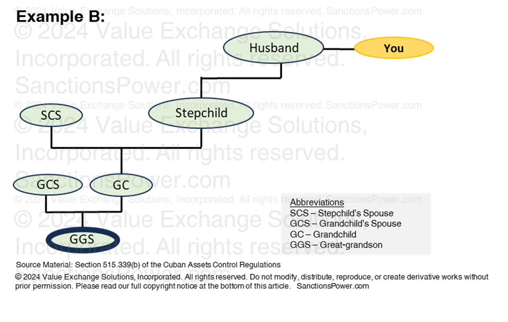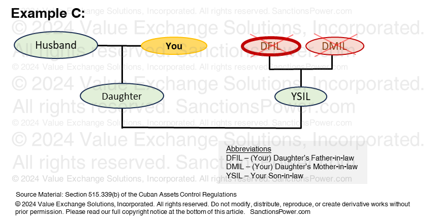 In some cultures, some might think that your daughter’s father-in-law are also family, or at least as ‘in-laws’, especially if you share grandchildren. However, for the purposes of compliance with Section 515.339(b) of the Cuban Assets Control Regulations, they are not ‘close relatives’: you share no common ancestor with your daughter’s father-in-law; they simply do not fit into The Close Relative Family Tree of those who are related via a common ancestor.